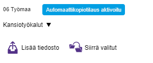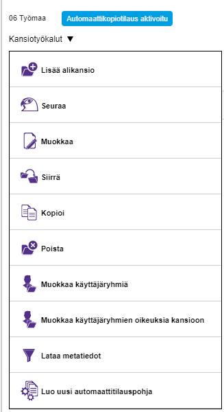 Projektin pääkäyttäjä voi tilata projektille automaattikopiotilausmoduulin ja sallia automaattitilausten käytön käyttäjittäin. Automaattikopiotilaukset asetetaan kansiokohtaisesti kansiotyökaluista. Mikäli automaattikopiotilausmoduulia ei ole liitetty projektille ja käyttäjälle ei ole sallittu sen käyttöä, ei tätä vaihtoehtoakaan näy kansiotyökaluissa.